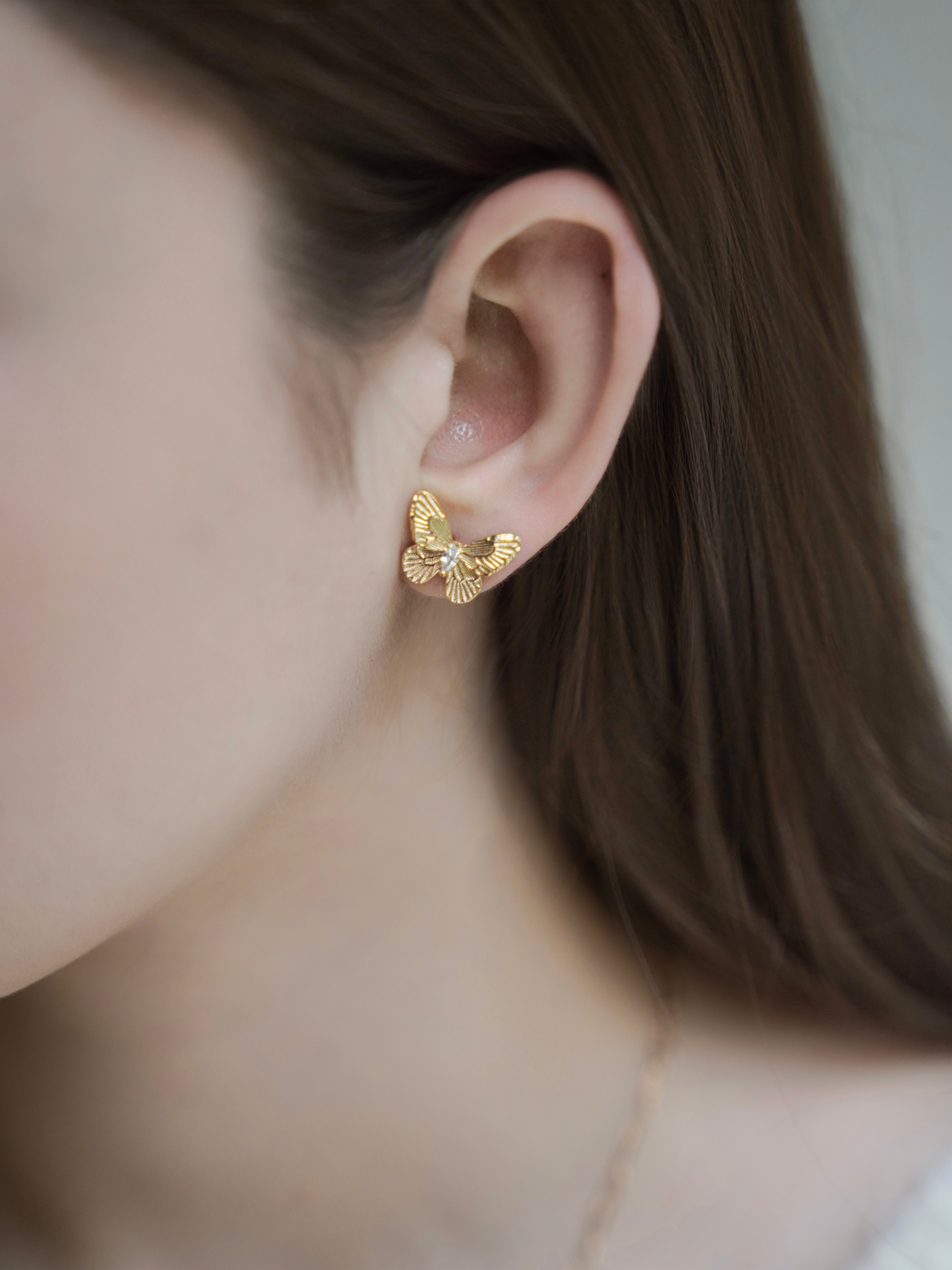 材質:法國18k 包金+鋯石 尺寸:約12mm x 15mm Made in Paris🤎 自留款の精心設計~立體蝴蝶造型耳環🦋 蝴蝶由閃閃馬眼石與雅緻法國包金淡金色拼接成 翅膀上雕刻有自己的立體紋路,生動還原蝴蝶翅膀的自然脈絡,極富層次感! 另外還採用特殊的磨砂處理,營造出朦朧柔和的視覺效果,與光亮邊緣形成對比,更顯高級! 每一處細節都盡顯用心💓耳環整體經過輕量化設計,兼顧美觀與舒適,即使長時間佩戴也毫無負擔! ⋱⋰ ⋱⋰ ⋱⋰ ⋱⋰ ⋱⋰ ⋱⋰ ⋱⋰ ⋱⋰ ⋱⋰ 首飾的鍍金採用了法國手工獨特plaqué or工藝,銅芯厚鍍3 microns以上18k真金,和頂級奢侈品牌用的同一種工藝。首飾在保色方面的表現遠遠超過大部分鍍金產品,致敏性也降至最低,非常適合每日穿戴。 Our plaqué or jewelry is made of brass and then covered with a thin layer of 18 k gold, with a thickness of 3 microns by electrolysing. This quality of gold plating guarantees that the jewelry will last for at least ten years. They are made in France and can be worn in peace because the gold plated minimizes the risk of allergy and oxidation. 全球直送✈️🌍 購買滿$600,即享本地(香港)免費順豐速遞送貨。 購買滿$800,即享澳門、台灣地區免費順豐速遞送貨。 正常下單後手工製作,約2-5日寄出。 接受Payme, FPS, PayPal 及銀行轉帳付款。 Worldwide Shipping ✈️🌍 Free Local(HK) Shipping On Orders Over $600 Free Macau and Taiwan Shipping on Orders Over $800 The items are handmade and will be shipped within approximately 2 - 5 days. Payment methods including Payme, FPS, PayPal and bank transfer are accepted.