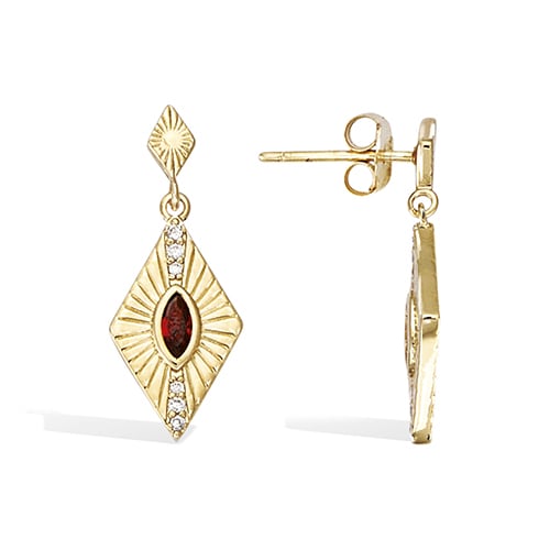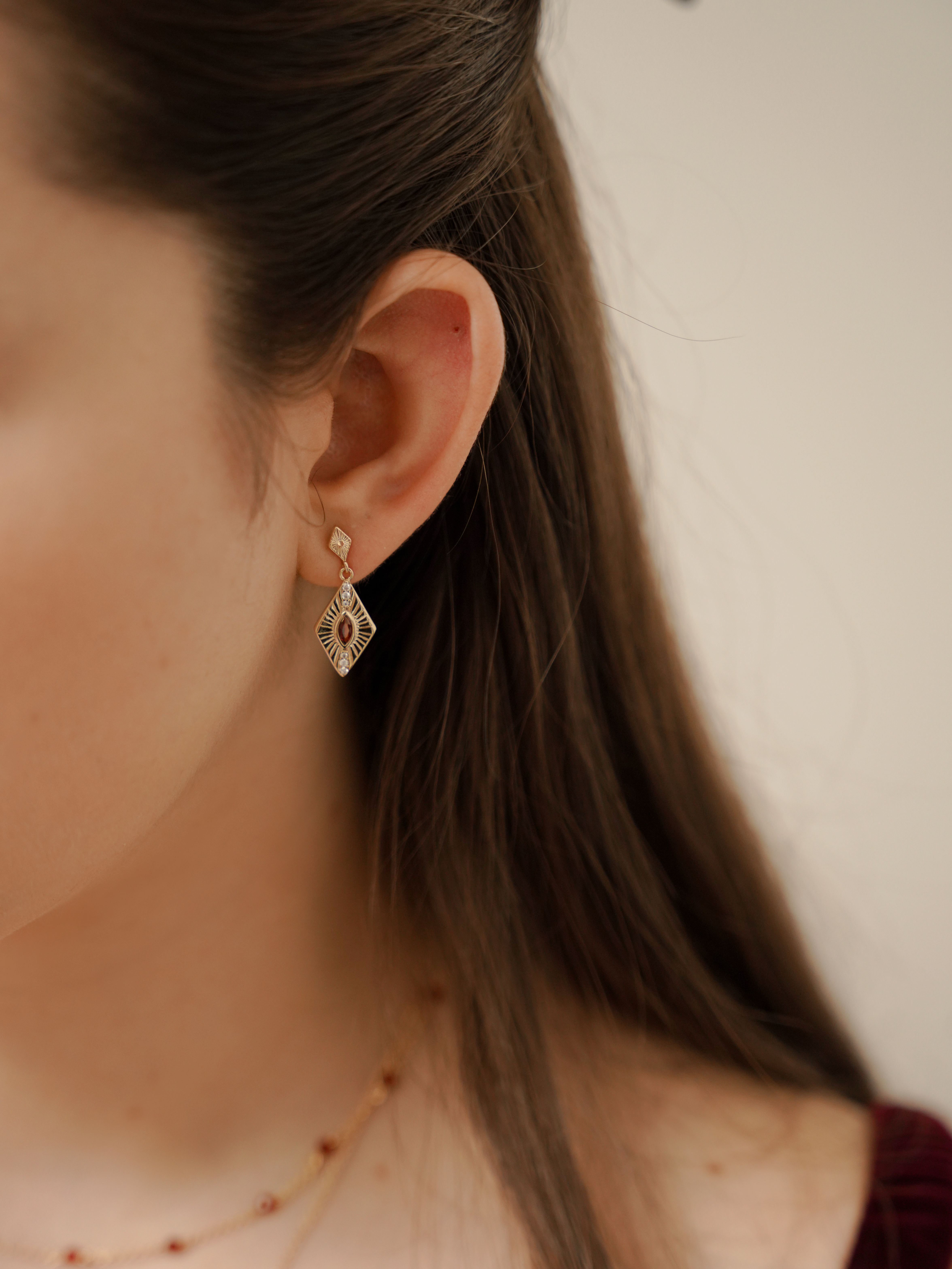 材質:法國18k 包金+石榴石 尺寸:約25mm x 10mm Made in Paris🤎 耳環拼接菱形面上,精緻的紋路由中央石榴石向四角徑向散開,如同透過窗格的光芒,能隨佩戴者移動產生流動的光影效果。 閃白鋯石與深邃石榴石形成經典而復古的對比, 加上法國包金色自帶一種經過歲月洗禮的溫潤感,而非刺眼的亮黃,更能襯托膚色,彰顯高貴氣質! 絕對是好值得購入與收藏的紅色首飾,完美展現您獨到的藝術品味!💎 ⋱⋰ ⋱⋰ ⋱⋰ ⋱⋰ ⋱⋰ ⋱⋰ ⋱⋰ ⋱⋰ ⋱⋰ 首飾的鍍金採用了法國手工獨特plaqué or工藝,銅芯厚鍍3 microns以上18k真金,和頂級奢侈品牌用的同一種工藝。首飾在保色方面的表現遠遠超過大部分鍍金產品,致敏性也降至最低,非常適合每日穿戴。 Our plaqué or jewelry is made of brass and then covered with a thin layer of 18 k gold, with a thickness of 3 microns by electrolysing. This quality of gold plating guarantees that the jewelry will last for at least ten years. They are made in France and can be worn in peace because the gold plated minimizes the risk of allergy and oxidation. 全球直送✈️🌍 購買滿$600,即享本地(香港)免費順豐速遞送貨。 購買滿$800,即享澳門、台灣地區免費順豐速遞送貨。 正常下單後手工製作,約2-5日寄出。 接受Payme, FPS, PayPal 及銀行轉帳付款。 Worldwide Shipping ✈️🌍 Free Local(HK) Shipping On Orders Over $600 Free Macau and Taiwan Shipping on Orders Over $800 The items are handmade and will be shipped within approximately 2 - 5 days. Payment methods including Payme, FPS, PayPal and bank transfer are accepted.